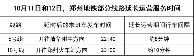 鄭州地鐵結(jié)合活動客流特點,滿足乘客出行需求,對線網(wǎng)運能進行優(yōu)化配置,科學調(diào)整行車組織措施,10月11日、12日線網(wǎng)部分線路延長運營服務時間,保障乘客出行需求。